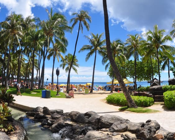 Waikīkī is a neighborhood of Honolulu on the south shore of the island of Oʻahu in the United States state of Hawaii. Waikiki is most famous for Waikiki Beach, which is one of six beaches in the district, along with Queen's Beach, Kuhio Beach, Gray's Beach, Fort DeRussy Beach and Kahanamoku Beach. Waikiki Beach is almost entirely man-made. Waikīkī is home to public places including Kapiʻolani Park, Fort DeRussy, Kahanamoku Lagoon, Kūhiō Beach Park and Ala Wai Harbor.